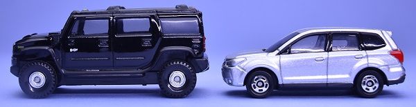 フォレスターは1/65スケールなので、1/67スケールのハマーH2とは縮尺がだいたい同じくらい。