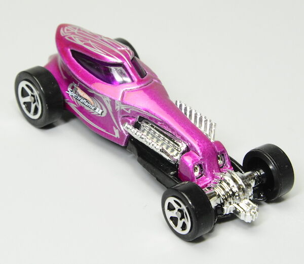ヴィンテージホットウィールのキャンディペイントであるスペクトラフレーム塗装をモチーフとしたセグメントで、本家には負けますが輝くようなメタリックピンクでダイキャスト製ボディが彩色されています。